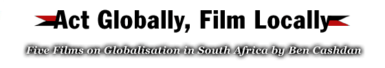 | 1. GLOBALISATION AND AFRICA: WHICH SIDE ARE WE ON? (55 mins) This is a guerrilla-cinema-style compilation of clips, constantly evolving and presented interactively by the filmmaker. With clips of local struggles in the townships of South Africa and material from the Durban Anti-Racism Conference in September and the World Economic Forum in Davos, Switzerland this year, the film raises questions about the impact of globalisation on ordinary South Africans. It also looks at the stance taken by ANC politicians - increasingly a part of those elite global institutions targeted by anti-globalisation activists. Hear Thabo Mbeki on the anti-globalisation protestors, George Soros on global economic injustice and Louis Michel (Belgium's foreign minister and chair of the EU Presidency) on colonialism's brighter side! Plus see Soweto activist Trevor Ngwane taking on Soros (in Davos) across a satellite link from the World Social Forum on Porto Alegre, Brazil. |