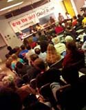Our evaluation of the event has emphasized the positive: great turnout, presentations, facilitiation, bringing groups together who have not worked closely together in the past. We also acknowledged falling short of our goal of reaching primarily immigrant audiences. A rough estimate from sign-up sheets and word of mouth is that at most a third of the audience was made up of immigrants, though a larger number of immigration activists were present. We hoped for more direct links between the local and global than we felt were brought out, but this can happen in future meetings. It was a good start.