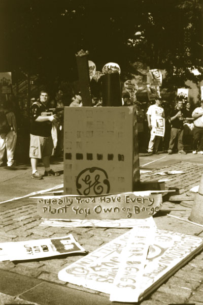 This summer, workers, retirees, labour activists, and supporters turned out to show solidarity with local General Electric workers of IUE Local 201 who, along with 14 of GE's unions, were facing tough bargaining with the company over salary, job security, and pension issues. Solidarity rallies were mounted worldwide two days before the June 25 negotiation deadline. The Boston rally, along with the requisite puppets was held in front of the building housing the financial operations of the giant multinational, subsequent to the union-led demonstrations at the plant in Lynn, Massachusetts.
