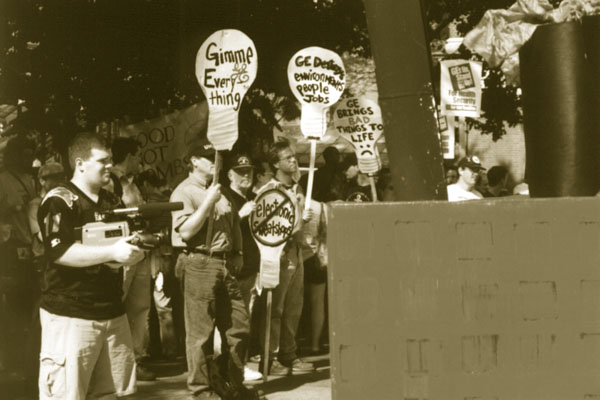 Activists joining the workers sought to highlight the many misdeeds of this global corporation including its dismal environmental record, involvement in the defense industry, and role in nuclear power generation. Moreover, Jack Welch, CEO of General Electric has been a pioneer in corporate-led globalization, coining the menacing phrase "putting every factory on a barge". Under his leadership, GE has downsized its US operations, closed whole plants, shifted manufacturing overseas, and forced workers with their backs against the walls to submit to ever larger cutbacks, speed ups, and weaker job security guarantees.