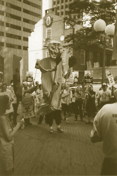 This summer, workers, retirees, labour activists, and supporters turned out to show solidarity with local General Electric workers of IUE Local 201 who, along with 14 of GE's unions, were facing tough bargaining with the company over salary, job security, and pension issues. Solidarity rallies were mounted worldwide two days before the June 25 negotiation deadline. The Boston rally, along with the requisite puppets was held in front of the building housing the financial operations of the giant multinational, subsequent to the union-led demonstrations at the plant in Lynn, Massachusetts.