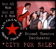 October 21-22 The San Francisco Mime Troupe is coming to town! This legendary theater troupe and its take-no-prisoners musical satires haven't been seen in Boston for over a decade, and their new show, "City for Sale," hits our problems on the head -- it's about gentrification and the housing crisis. BGAN has tickets for $15, discounted from the $22.50 boxoffice price. After this performance there is a dialogue with the Troupe and then a cast party nearby in Uphams Corner till all hours. To get tickets, send a check made out to Martha London, with "Mime Troupe" in the memo line, to BGAN, PO Box 2362, Boston MA 02107. Specify the performance time you want. Enclose a self-addressed stamped envelope.