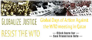 | Despite the tragedy of Sept. 11, trade ministers from developed and developing countries launched a new round of trade talks in Doha, Qatar, November 9-13, 2001. For us in the global justice movement that saw its US expression reach a new stage in Seattle, the fourth ministerial meeting, owing to its location in the Persian Gulf, was never a high priority for an outright large-scale mobilization. Much of the work of getting the voices of the poor countries, labor, and environmental concerns heard at these talks has been carried forth through lobbying campaigns and NGO pressure on the delegates. However, those solidarity actions that were planned for November have been interrupted and setback by the events of Sept. 11. Furthermore, free trade advocates have seized the political space opened by the Sept. 11 tragedy to opportunistically push their pro-corporate agenda. As such, BGAN organized a press conference for Thursday November 8. The press conference rallied the voices of civil society in expressing concern about the WTO and its implications for labor, the environment, human rights, public health, access to AIDS medicines, agriculture and food safety, national and local sovereignty, and public services. This panoply of issues covering the breadth of human interests, stands to be decisively affected by current and future trade policies under the WTO. By standing together at this critical juncture, we demonstrated that we remain united for fair and democratic trade that serves the public interest abroad and here at home. For more information on the press conference, click here. Thank You and Good Luck!